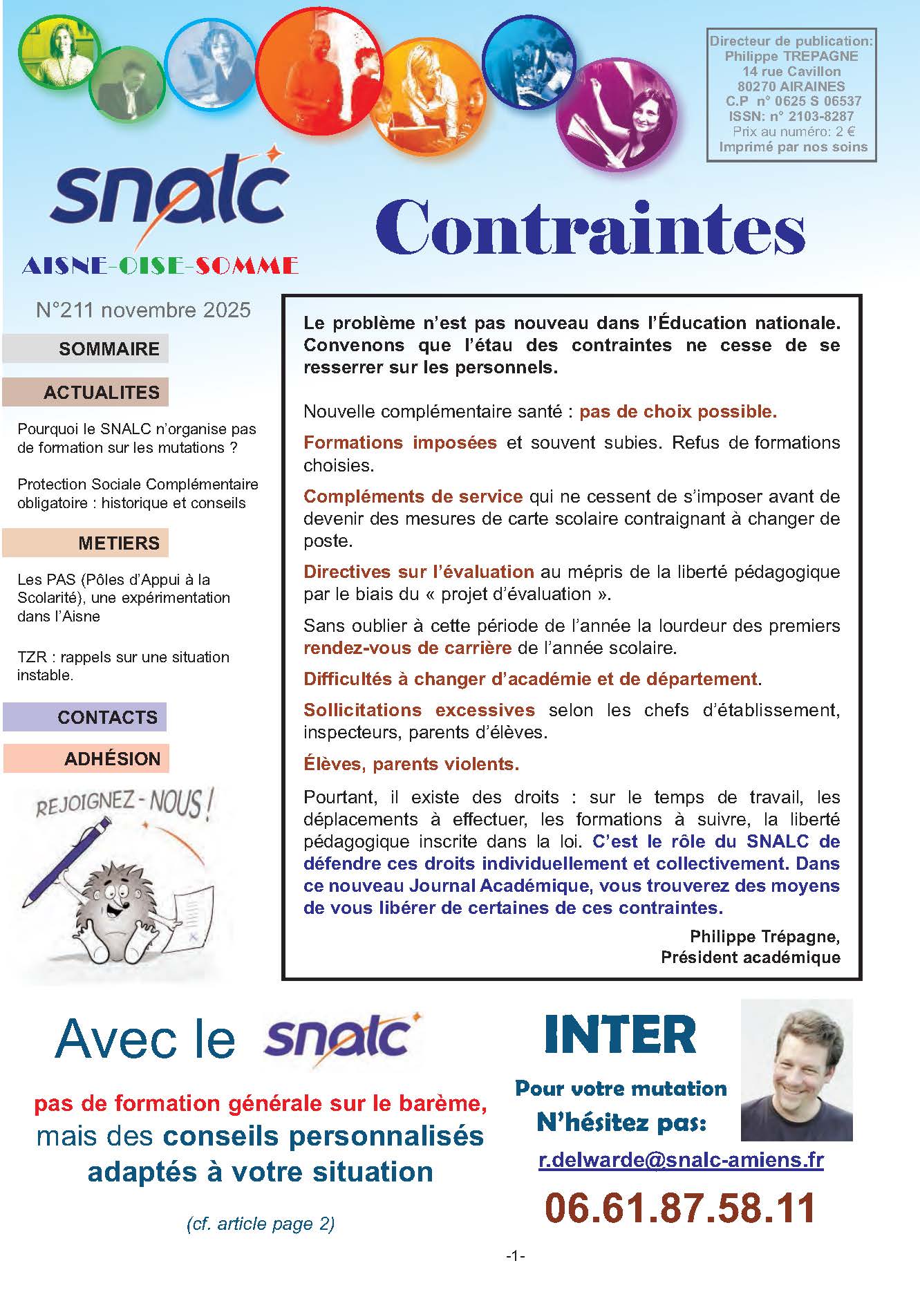 Notre journal académique n°199 au sommaire: Assassinat de Dominique Bernard le SNALC de Picardie reçu en audience par le recteur Mouvement intra académique BDE TZR